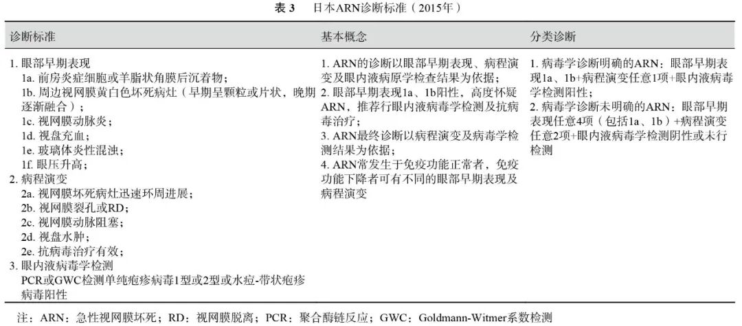 2015年,日本标准将ARN诊断分为“病毒学诊断明确”与“病毒学诊断未明确”两类,综合眼部早期表现、病程演变及眼内液病原学结果进行判断[40](表3)。该标准诊断灵敏度为89%,特异性为100%,能有效实现早期诊断。