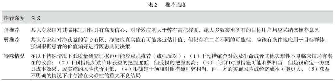 本共识将推荐强度分为“强”与“弱”两个等级。强推荐表明共识专家组对该推荐意见代表了当前最佳实践具有高度信心,建议目标用户普遍采纳。弱推荐则表示专家组对该推荐意见有一定信心,但建议在目标群体中结合具体条件应用,并强调医患共同决策(表2)。对于专家组认为重要但不适于采用证据级别和推荐强度进行表述的内容,本共识采用最佳临床实践声明(BPS)进行阐述。所有推荐意见或BPS均需通过专家组对公开讨论的研究证据进行审议,并借助德尔菲问卷调研法和专家会议法达成共识。每项推荐或声明必须在专家组投票中获得至少80%的同意率方可被采纳。