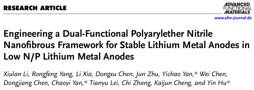 X. Li, R. Yang, L. Xia, D. Chen, J. Zhu, Y. Yan, W. Chen, D. Chen, C. Yan, T. Lei, C. Zhang, K. Cheng, Y. Hu, Engineering a Dual-Functional Polyarylether Nitrile Nanofibrous Framework for Stable Lithium Metal Anodes in Low N/P Lithium Metal Anodes. Adv. Funct. Mater. 2025, e09246.