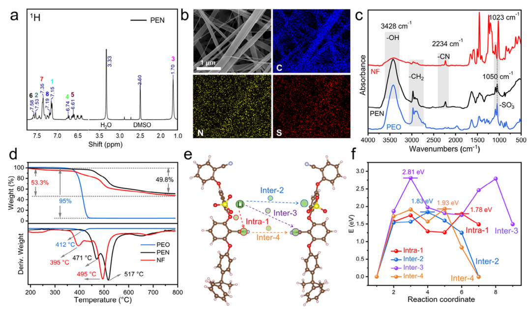 本研究合成了一种含磺酸基和腈基的聚芳醚腈(PEN),并用于构建NF保护层以稳定锂金属负极。PEN主链提供机械稳定性,功能基团促进锂离子均匀分布并增强其配位能力。通过FTIR、NMR、TGA等手段验证了PEN结构与热稳定性,DFT计算表明该材料有利于抑制枝晶生长。NF层可实现均匀的锂沉积,减少极化,在8 mA cm⁻²下稳定循环超过2500小时。与硫碳正极(N/P=3)匹配后,电池在550次循环后容量保持率达92.9%,并在柔性锂硫软包电池中表现出优异性能,显示出其在高性能、低N/P比柔性锂电池中的应用潜力。