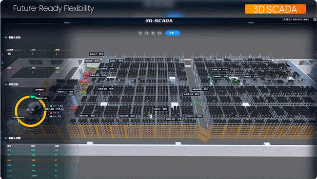 该仓库深度融合海柔创新数字孪生技术,通过1:1数字孪生体映射物理仓库,实现全域设备状态、库存分布、作业进度的三维可视化监控与秒级响应。在3D SCADA数字孪生平台的“全景视角”下,武汉工厂大幅提升了生产计划与物流调度协调效率,使仓储运营真正实现"预测式管理"。