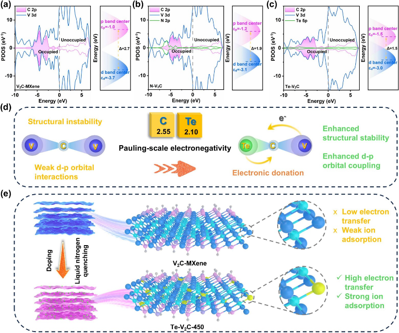 Fig. 1. a-c) The PDOS of V2C-MXene, N-V2C and Te-V2C (the inset depicted P band center of C 2p and d band center). d) The effects of the Te doping in promoting the structural stability of V2C-MXene. e) Schematic representation of the synthesis route for Te-V2C-450.