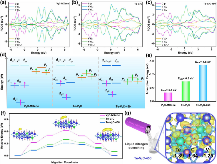 Fig. 4. a-c) The PDOS of Te-V2C-450 and counterparts. d) V 3d energy levels in Te-V2C-450 and counterparts. e) Adsorption energy of Te-V2C-450 and counterparts. f) Relative energies of Te-V2C-450 and counterparts. g) Bader charge and differential charge density map for Te-V2C-450.