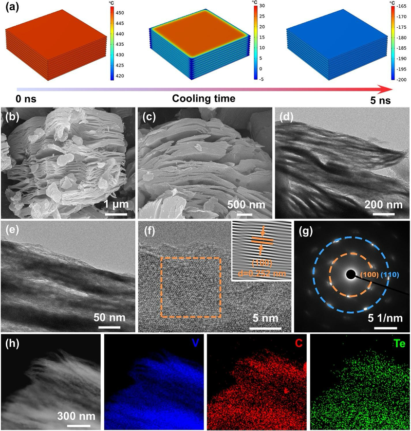 Fig. 2. a) The finite element simulation of the cooling time of the 3D model. b, c) SEM images of Te-V2C-450. d, e) TEM images of Te-V2C-450. f) HRTEM images of Te-V2C-450. g) SAED images of Te-V2C-450. h) EDS mapping of Te-V2C-450.