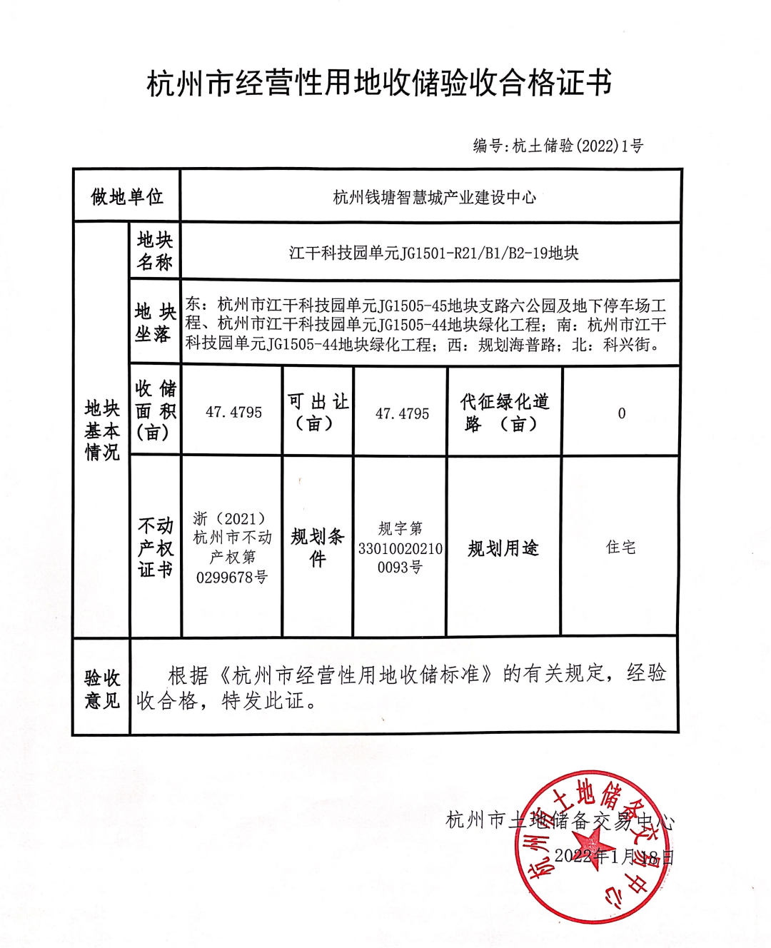 近日,钱塘智慧城投资开发有限公司迎来了2022年杭州市第一张《杭州市经营性用地收储验收合格证书》(杭土储验(2022)1号),标志着“江干科技园单元JG1505-R21/B1/B2-19地块”跨入了收储篮,是全市首宗完成收储的地块。