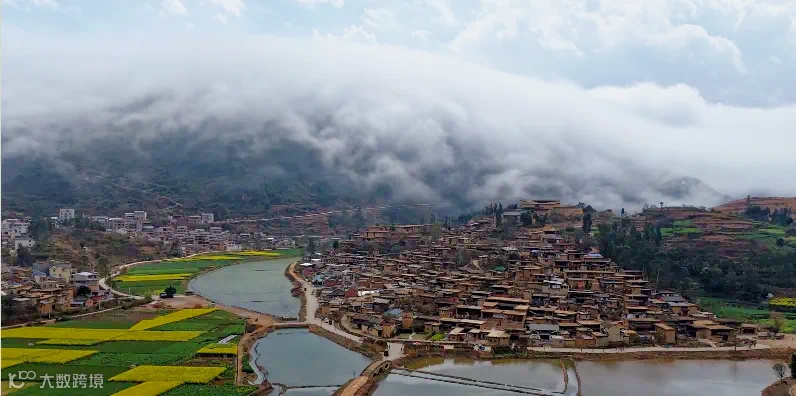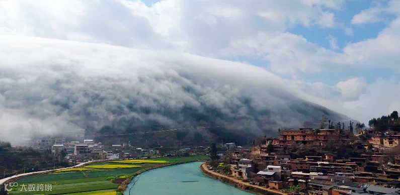 翻腾的瀑布云与安静祥和的古村