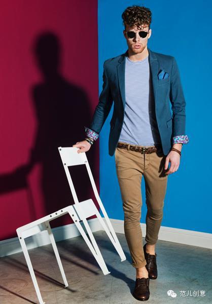 孔雀蓝西服外套+蓝色细条纹T恤+深卡其色九分休闲裤+棕色系带皮鞋+棕色编织腰带