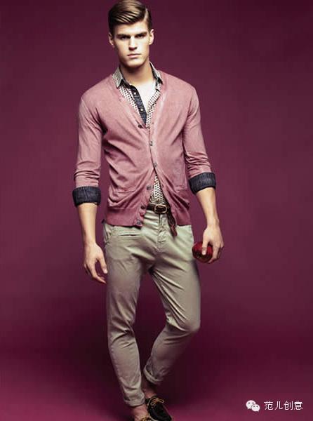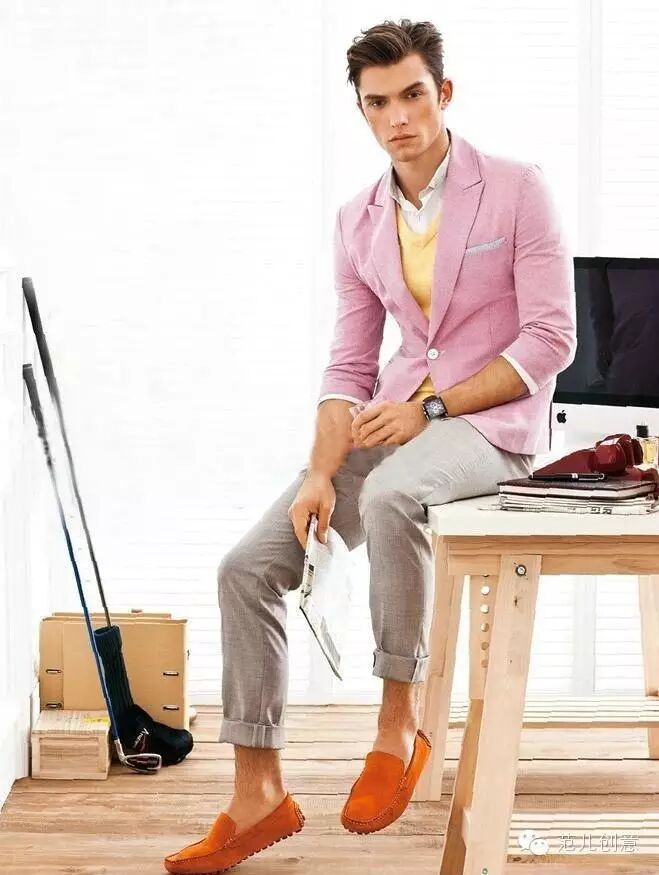 时尚达人,粉色一粒扣西服+黄色V领毛衣+浅灰色休闲裤+橘色一脚蹬皮鞋