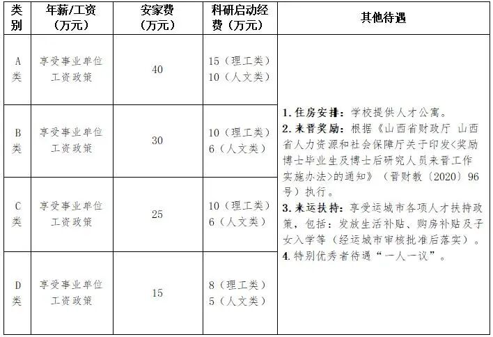 (2)引进待遇 全职:提供100平米住房及安家费60-80万元,科研启动经费不少于20万元。符合条件的可申请来晋奖励和运城市各项人才扶持政策。非全职:采取“按绩取酬”方式发放待遇,具体待遇一人一议。
