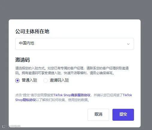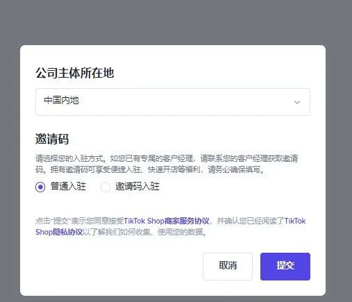 完成注册后,根据自己的营业执照选择公司主体所在地。邀请码的话,有就填写,没有的话直接选择“普通入驻”。【需要邀请码的可以关注我或加微信:znch333】