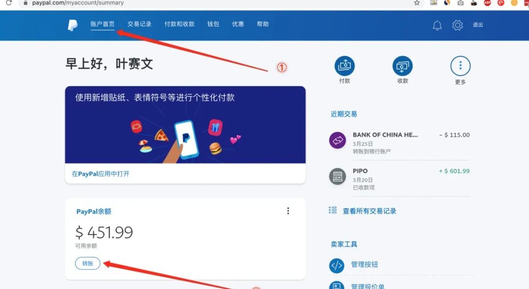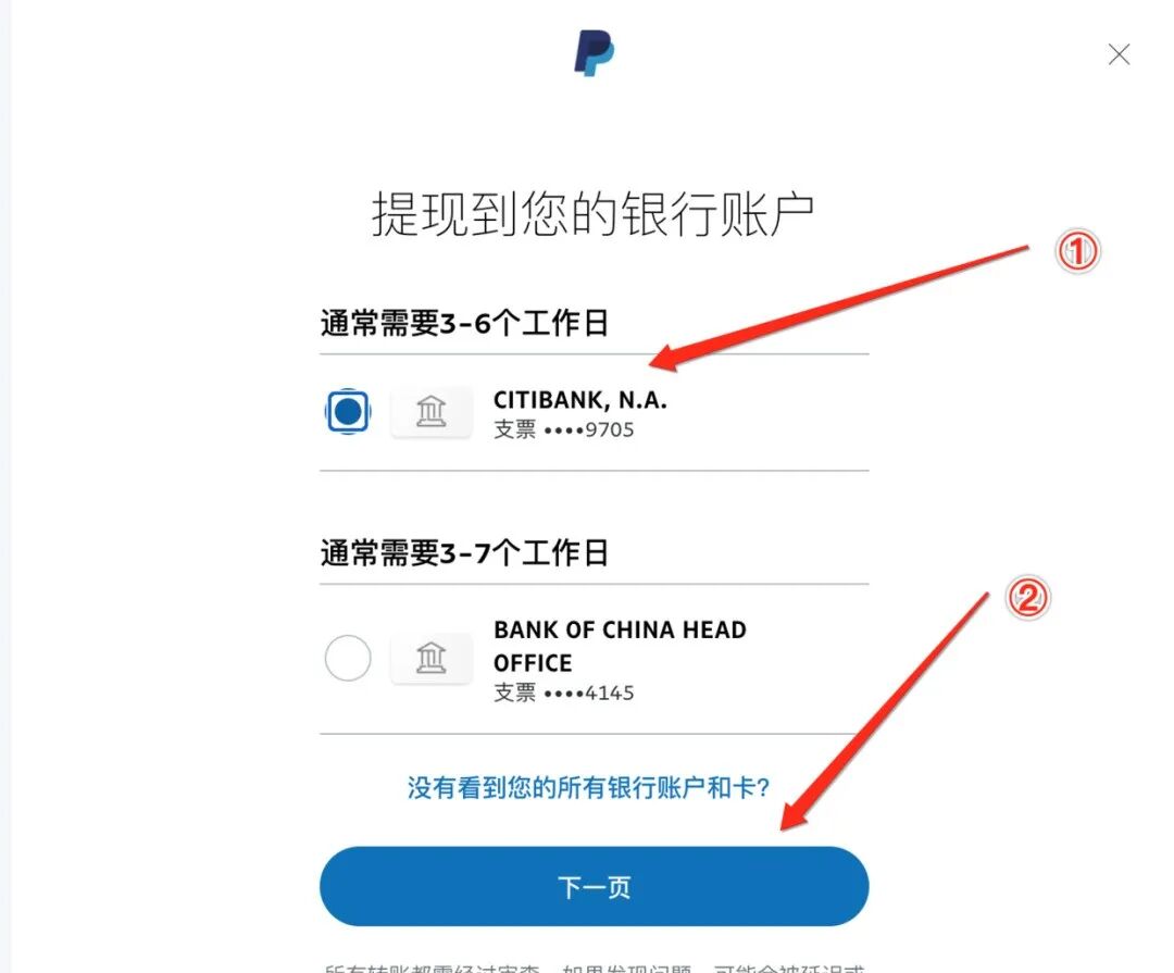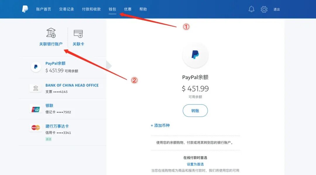 2.1 关联银行账号,登录PayPal, ① 点击钱包 ② 单击“关联银行账号”