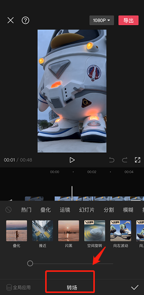 5、添加视频转场:在两个切割的视频中间,添加想要的转场特效;