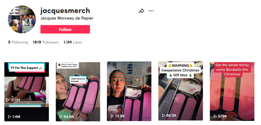 其中达人jacquesmerch(@jacquesmerch)发布多条视频介绍一款“创可贴”造型的汽车贴纸,这款贴纸非常具有创意性,且有多种颜色款式,吸引大量年轻人的目光。该达人相关产品带货视频播放量基本在几万到几十万不等,此外还具有百万播放量带货视频。