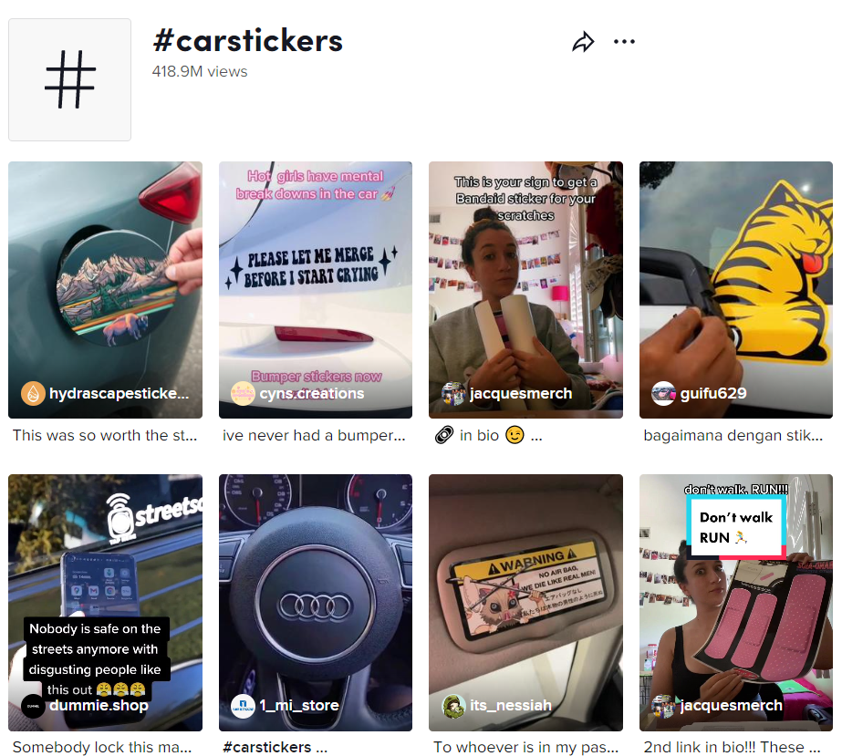 截至目前该视频标签#carstickers(汽车贴纸)曝光量高达4.18亿播放,除该视频中产品外还有许多不同款式的汽车贴纸,这些贴纸分别可以粘贴在汽车的各个位置,引起网友们的兴趣。