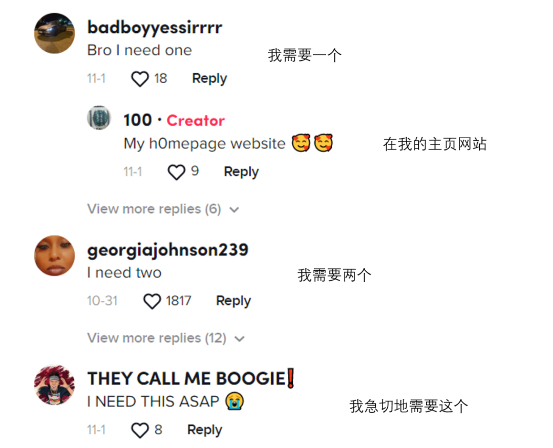 视频在Tik Tok发出后,在评论区很多用户都在表达着对该款汽车贴纸的喜欢,表示自己想要购买并询问购买方式,该账号也在积极回复网友评论,并在评论区置顶购买方式。