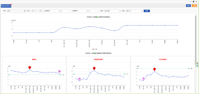 (一)水环境数据集中管理。实现地表水及地下水监测数据存储、数据展示、数据分析、历史数据查询、数据统计、趋势曲线、质量评价、报表输出等功能。通过内置的多种可靠性检验和实时监控方法能够辅助对海量数据自动筛检,对异常数据、缺失数据进行标识,提高数据维护的自动化水平和效率。同时,平台预留多种类型的数据接口,可支持后续新建站点的接入,并可与第三方环保信息化平台无缝集成。