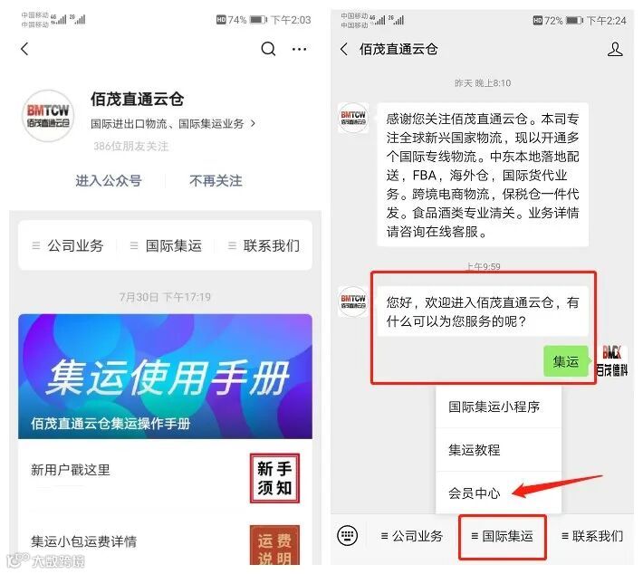 扫码点击进入公众号,进入国际集运--“会员中心”