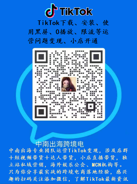 一个人很容易踩坑迷路,一群人才能够走的更远。中南出海有专业团队在运营TikTok变现,涉及店群+短视频带货+达人带货,小店直播带货,独立站私域营销,海外娱乐公会、MCN机构等。只为你分享最实战的跨境电商落地经验,感兴趣的扫码关注添加微信,了解TikTok最新资讯,带你一起跨境出海掘金。