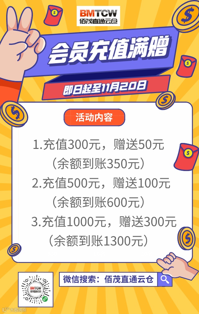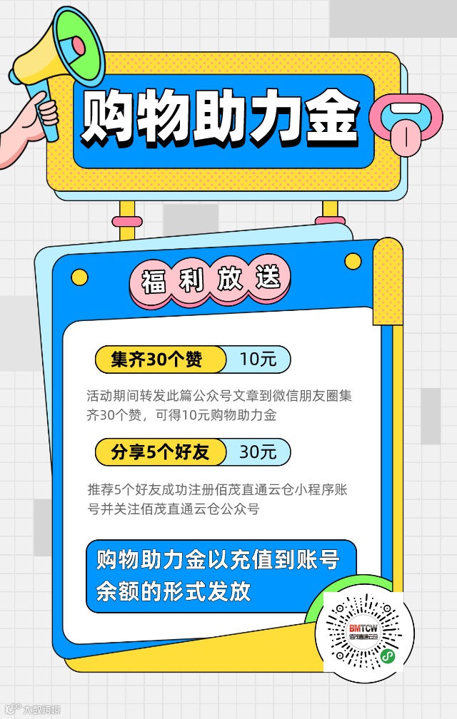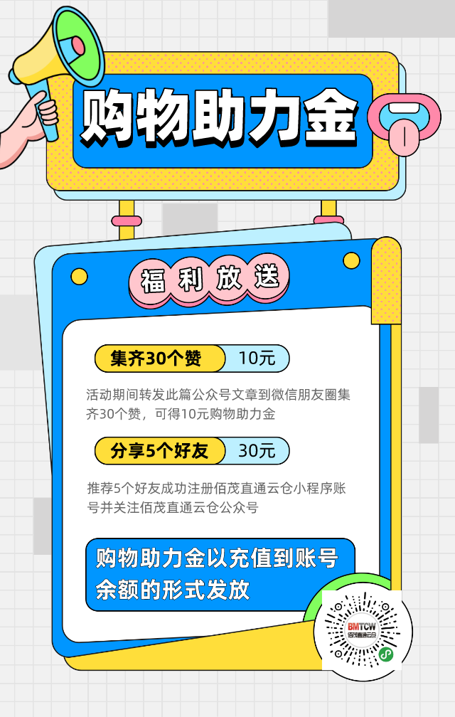 推荐5个好友成功注册佰茂直通云仓小程序账号并关注佰茂直通云仓公众号,可得30元购物助力金。(购物助力金以充值到账号余额的形式发放)