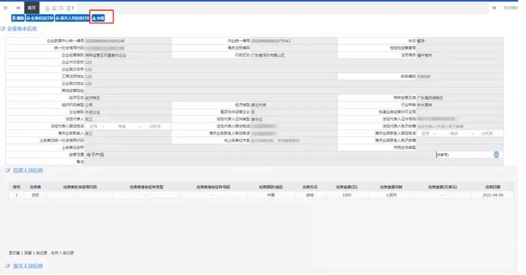 9.填好相关信息后,点击“申报”按钮,提交备案申请。