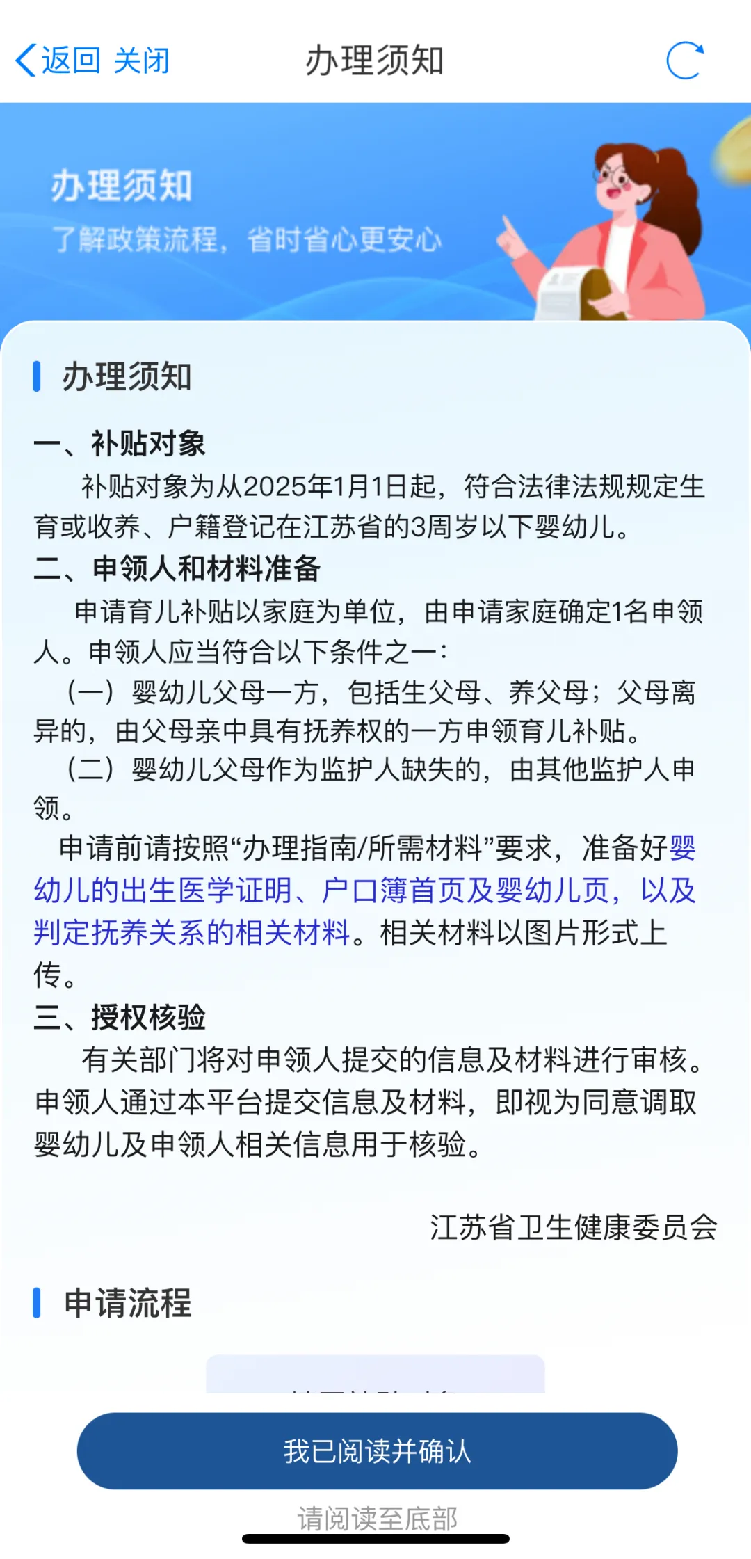 在“育儿补贴”服务首页,可查看办理指南、咨询电话、准备材料、补贴对象、申领人资格等信息。
