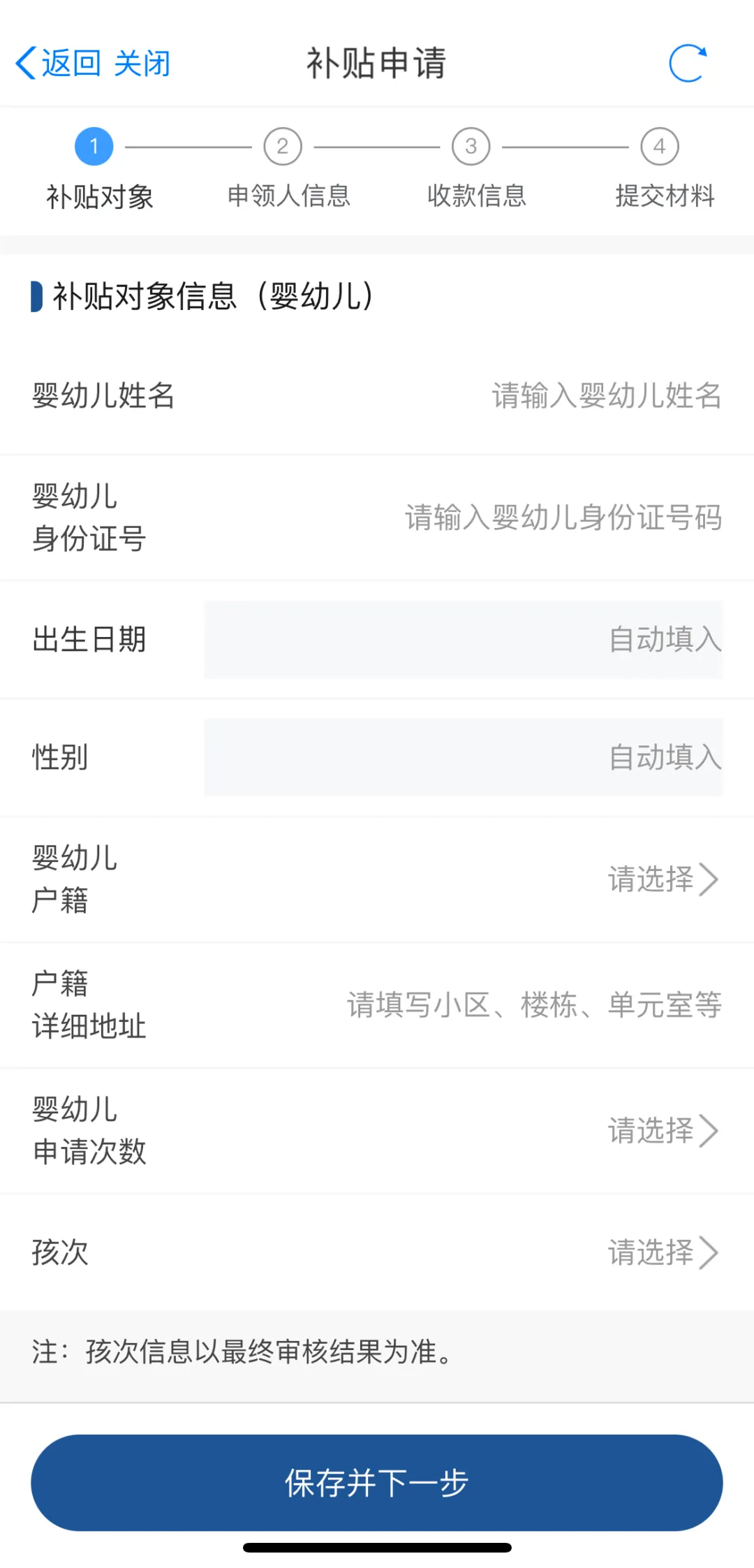 填写补贴对象信息(婴幼儿),保存进入下一步。