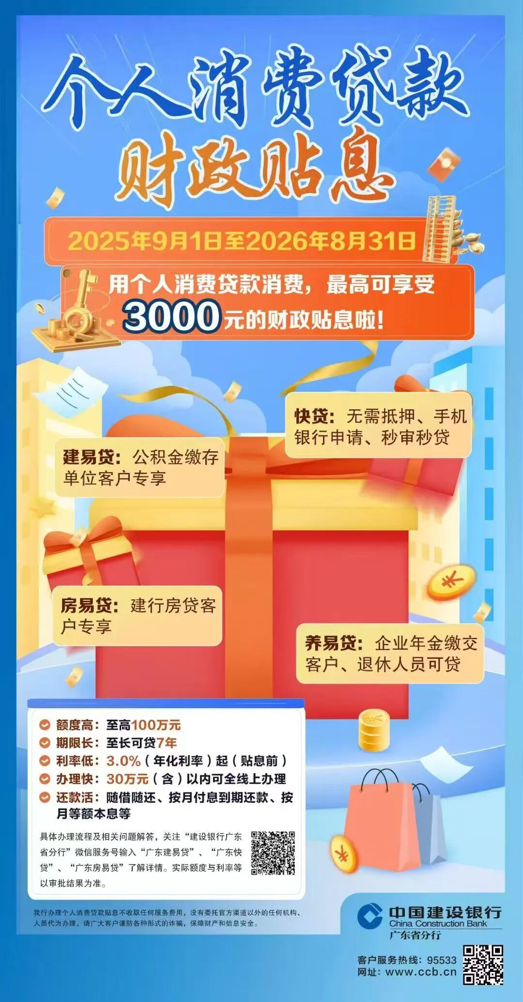 《个人消费贷款财政贴息政策实施方案》提出,2025年9月1日至2026年8月31日期间,居民个人使用贷款经办机构发放的个人消费贷款(不含信用卡业务)中实际用于消费,且贷款经办机构可通过贷款发放账户等识别借款人相关消费交易信息的部分,可按规定享受贴息政策。