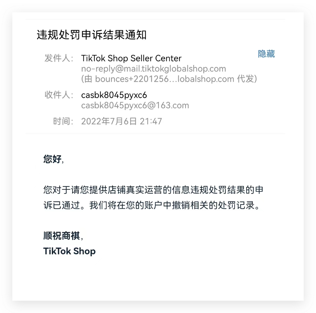 Tik Tok 管理员您好!今天查看邮件时候,发现收到店铺被永久封禁,查看了封禁原因是售卖假货!我们公司最近刚租好场地,没有来及上传产品和直播,目前还处于养号的状态,我不知道怎么出现违规产品,请求管理员帮忙核实一下是不是系统误判!