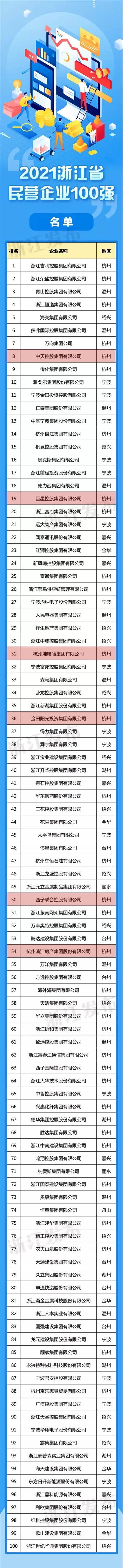 “2021年浙江省民营企业100强”榜单