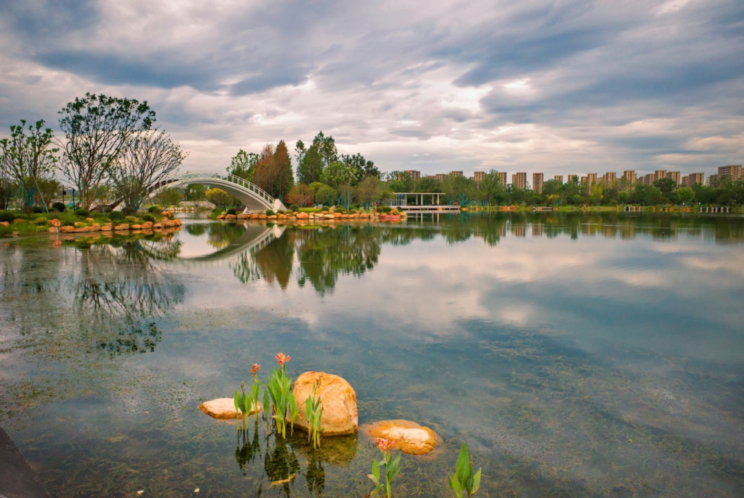 追溯历史,丰收湖原为丰收水库,是九堡、乔司一带居民的生命之源,如今充分利用水系,从产业、文化、生态等多方面着手,通过地面、水面、空中多维游线交织交错,体现“人在画中、画在人中”的诗画园林空间,成为集“生态保护、文化体验、创新交流、休闲游憩”于一体的“城市海绵”和“城市绿肺”。