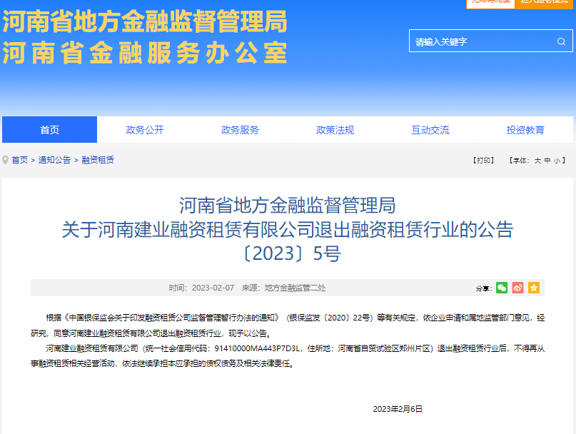 值得注意的是,2023年2月6日,河南省地方金融监督管理局公告,同意河南建业融资租赁有限公司退出融资租赁行业。