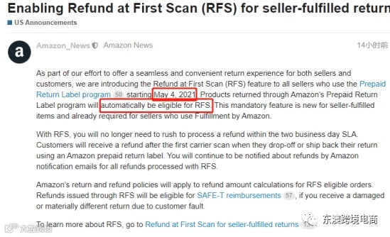 简单来说就是,如果买家申请退货,且使用亚马逊预付退货标签,在快递点扫描寄出退货包裹后,亚马逊系统立即发起退款,无需卖家在2个工作日内主动发起退款,当然,所有通过RFS功能执行的退款,亚马逊会给卖发送通知邮件。