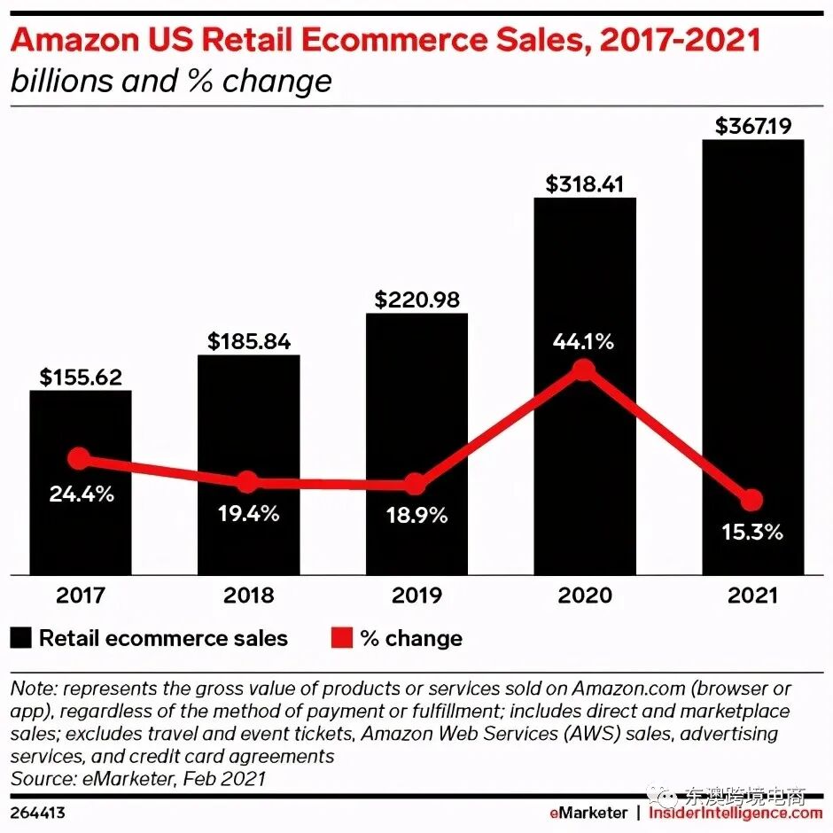 预计2021年,亚马逊在美国的电商销售额将达到3671.9亿美元,占美国电商总销售额的40.4%,市场份额将再次增加。
