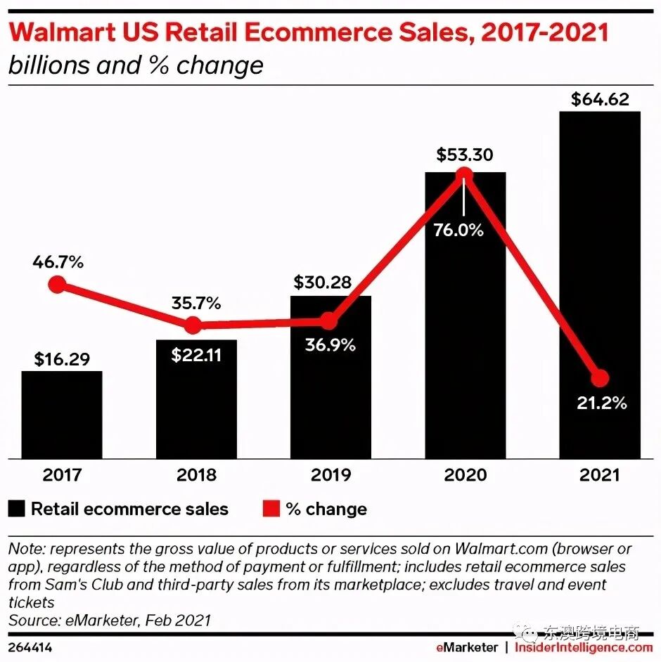 疫情助推沃尔玛在美电商业务增长了76.0%,获得53.3亿美元的销售额,占美国电商总销售额的6.7%。