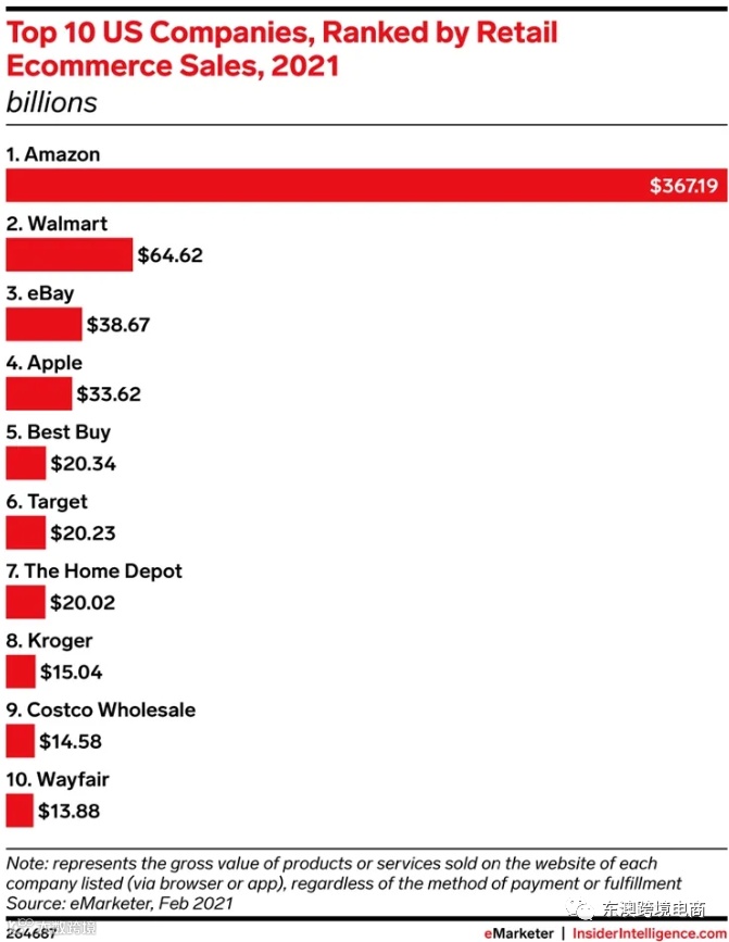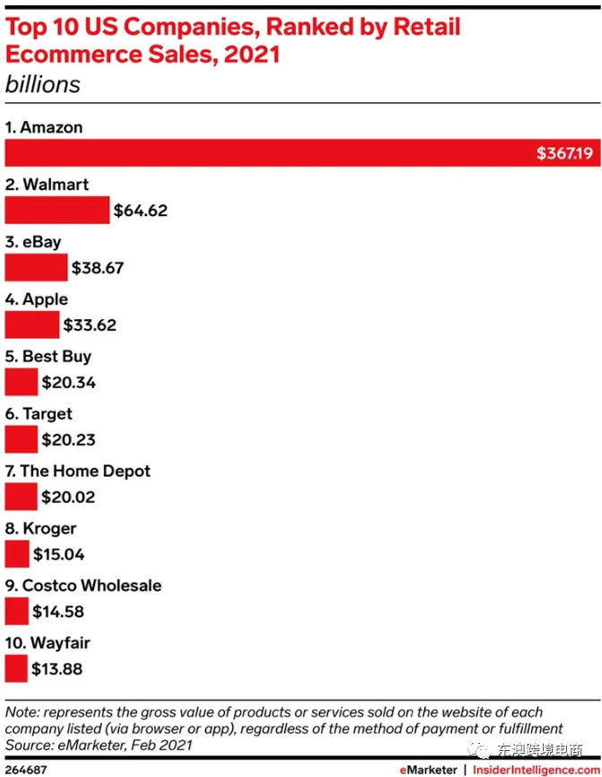 eMarketer发布2021美国10大零售电商名单,就2020年疫情前后及2021年各大电商在美销售趋势做出预测。(eMarketer的美国10大零售电商名单每半年更新一次,最近更新是在2020年2月、2020年9月和2021年2月。)