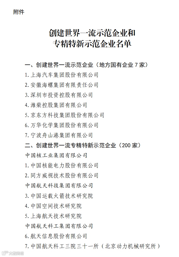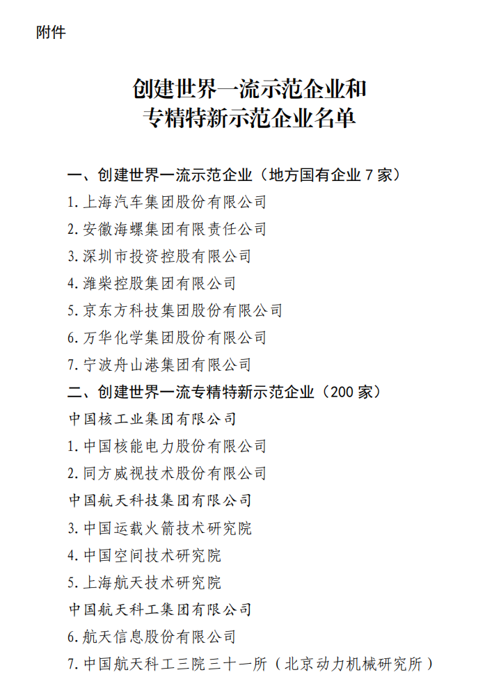 据了解,本次入选创建世界一流示范企业的均为地方国企,分别是上汽集团、安徽海螺集团、深圳市投资控股集团、淮柴控股集团、京东方科技集团、万华化学集团、宁波舟山港集团。