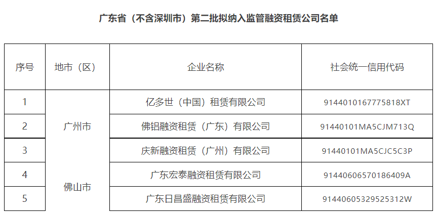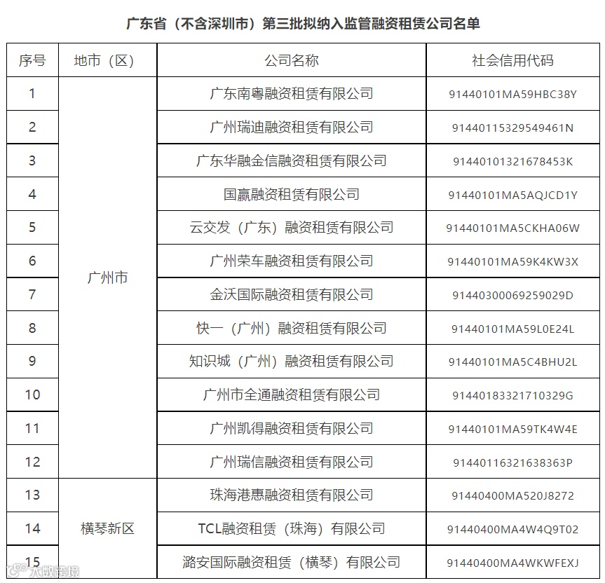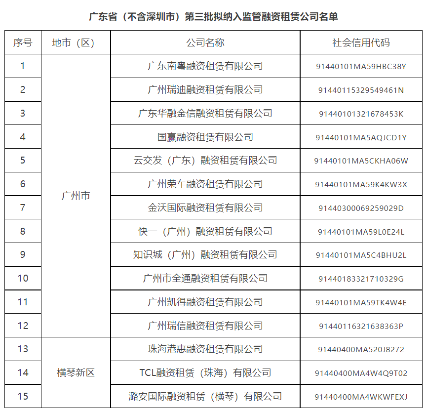 根据《融资租赁公司监督管理暂行办法》《关于印发〈商业保理企业名单制管理工作方案〉的函》有关要求,经各地市金融局推荐,我局组织审核,并会省有关部门,拟将15家融资租赁公司、5家商业保理公司纳入广东省(不含深圳市)第三批监管名单,现予以公示。