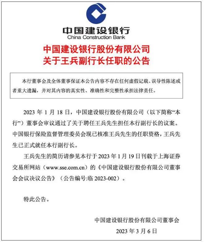 建行公告称,2023年1月18日,该行董事会审议通过了关于聘任王兵担任该行副行长的议案。银保监会现已核准王兵的任职资格,王兵已正式就任该行副行长。