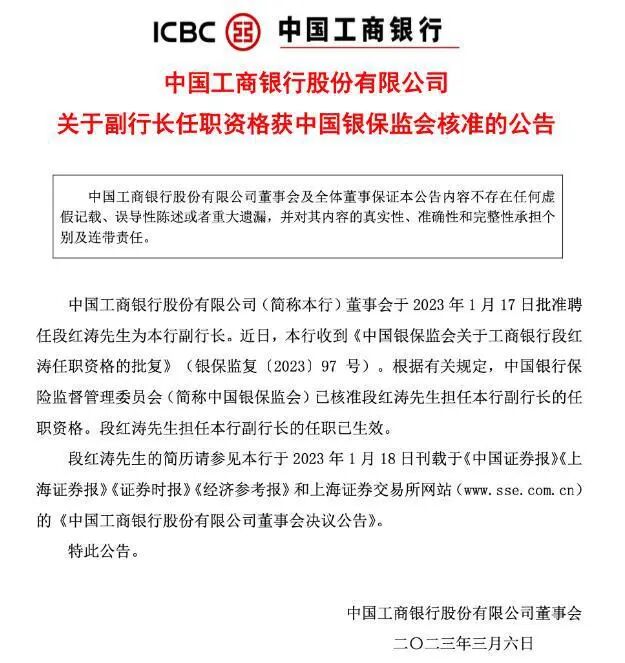工商银行公告,该行收到《中国银保监会关于工商银行段红涛任职资格的批复》。根据有关规定,中国银保监会已核准段红涛担任该行副行长的任职资格,段红涛担任工行副行长的任职已生效。