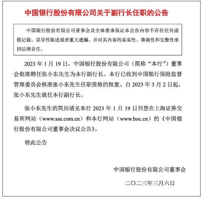 3月6日,中国银行公告称,该行收到中国银行保险监督管理委员会核准张小东任职资格的批复。自2023年3月2日起,张小东就任中国银行副行长。