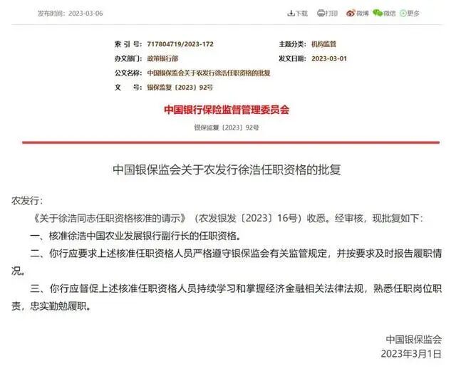 3月6日,中国银保监会公布批复,核准徐浩农发行副行长的任职资格。