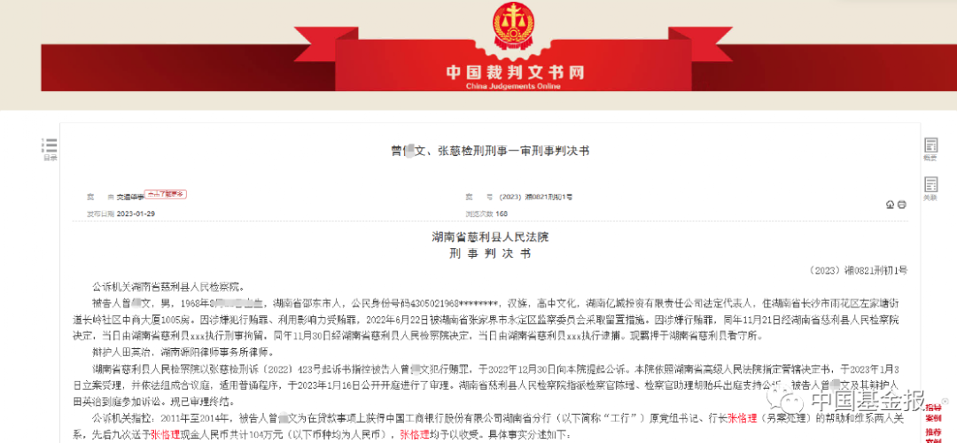 近日,中国裁判文书网发布的一则刑事判决书显示:2011年至2014年,被告人曾某文为在贷款事项上获得工行湖南省分原党组书记、行长张恪理的帮助和维系两人关系,多次送予现金,张恪理均予以收受。