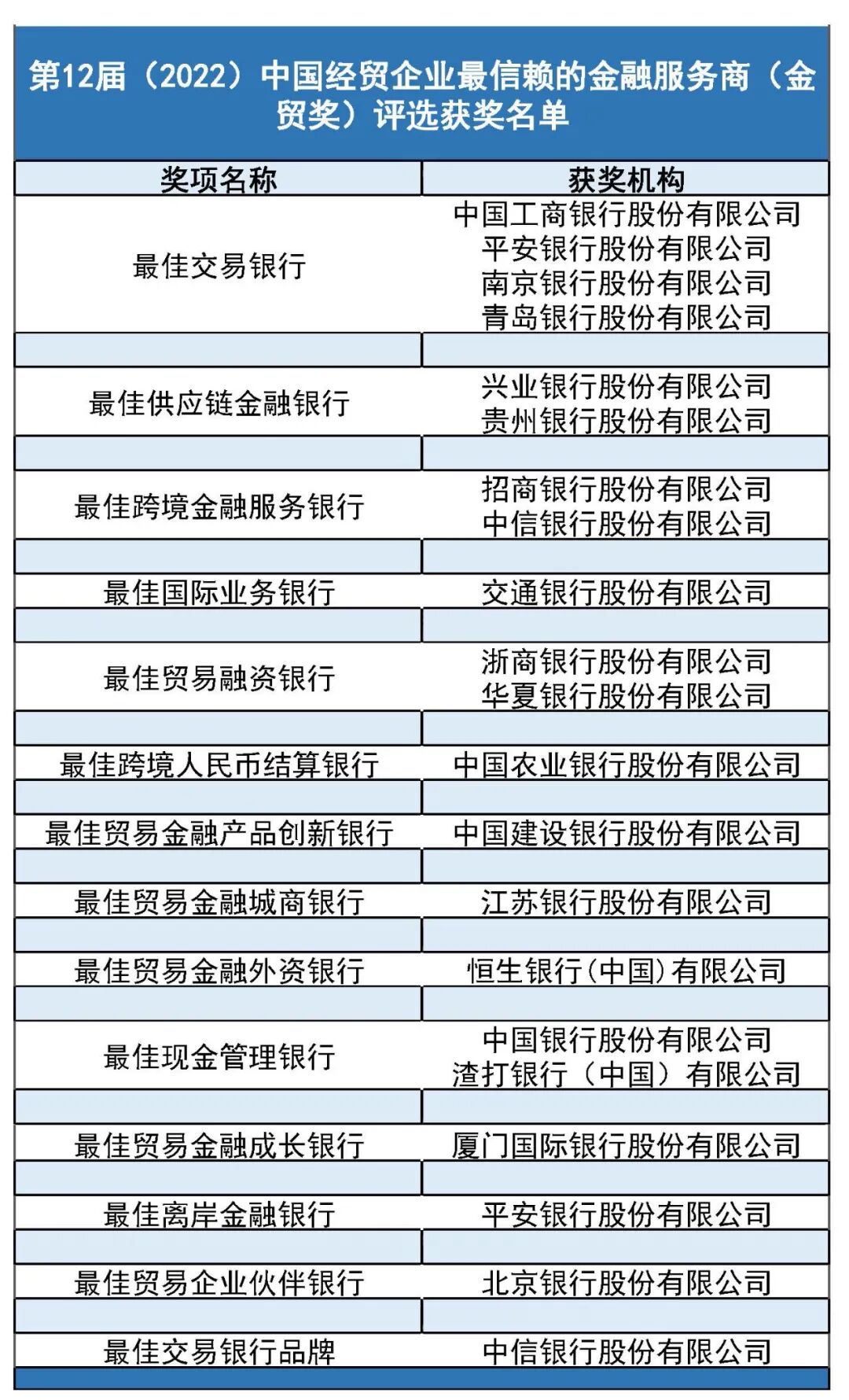 第12届中国经贸企业最信赖的金融服务商(金贸奖)评选拟获奖名单公示(排名不分先后)