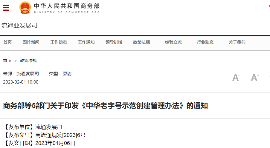 为立足新发展阶段,完整、准确、全面贯彻新发展理念,促进老字号创新发展,充分发挥老字号在商贸流通、消费促进、质量管理、技术创新、品牌建设、文化传承等方面的示范引领作用,服务构建以国内大循环为主体、国内国际双循环相互促进的新发展格局,商务部、文化和旅游部、市场监管总局、文物局、知识产权局联合制定了《中华老字号示范创建管理办法》,现印发给你们,请遵照执行。