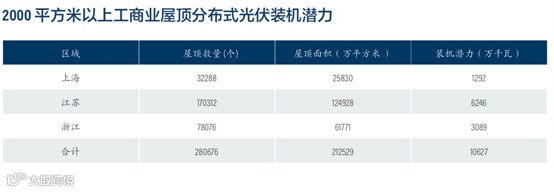 该系统对江浙沪地区面积为2000平方米以上的屋顶资源进行识别和筛选,共识别出具备光伏安装潜力的屋顶28万余个,总面积21.2亿平方米。由于人工智能识别系统的矩形框是固定角度,与卫星图片中屋顶的角度并不能完全一致,考虑这一误差,以及屋顶朝向对装机潜力的影响等因素,按照50%的可用面积初步估算,保守测算潜在的装机潜力可达10627万千瓦。