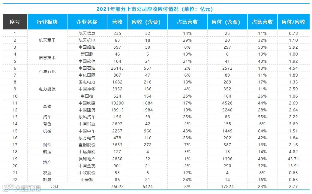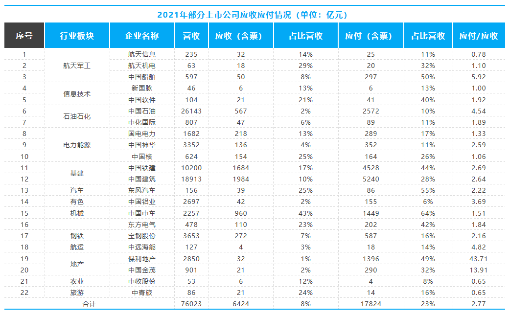 从上表中可以看出,22家所选企业中,应收账款占比营业收入超过20%的有7家,说明这类大型企业下游回款较慢,大量资金被下游客户占用。22家企业中应付账款占比营业收入超过20%的达到11家,说明上游供应商同样面临大量应收账款无法及时收回,且从22家企业应付账款总额是应收账款总额的2.77倍来看,处于相对弱势的上游供应商面临的情况更加严峻。