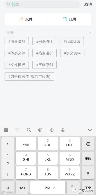 1.1 进入医咖俱乐部主页后,不断下滑就可以按时间顺序查看最新上传资料。但是1500份资料那么多怎么才能找到自己想要的文件呢?别急,点击右上角的放大镜后,可以进入搜索栏。