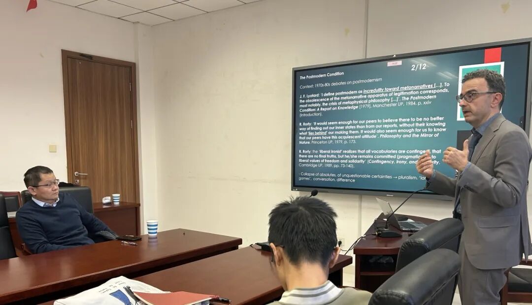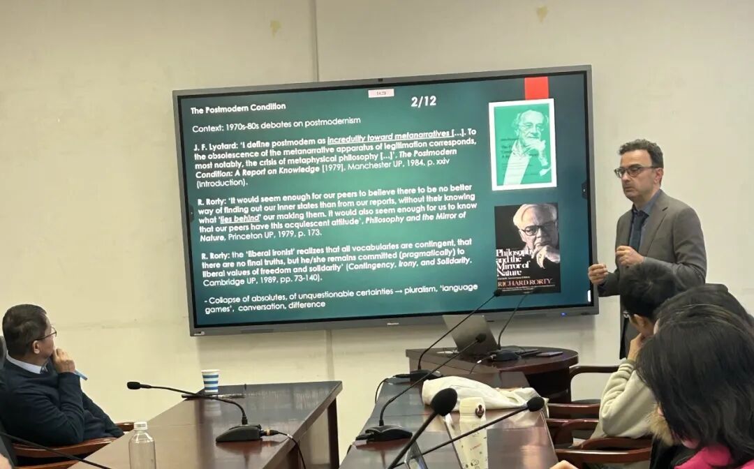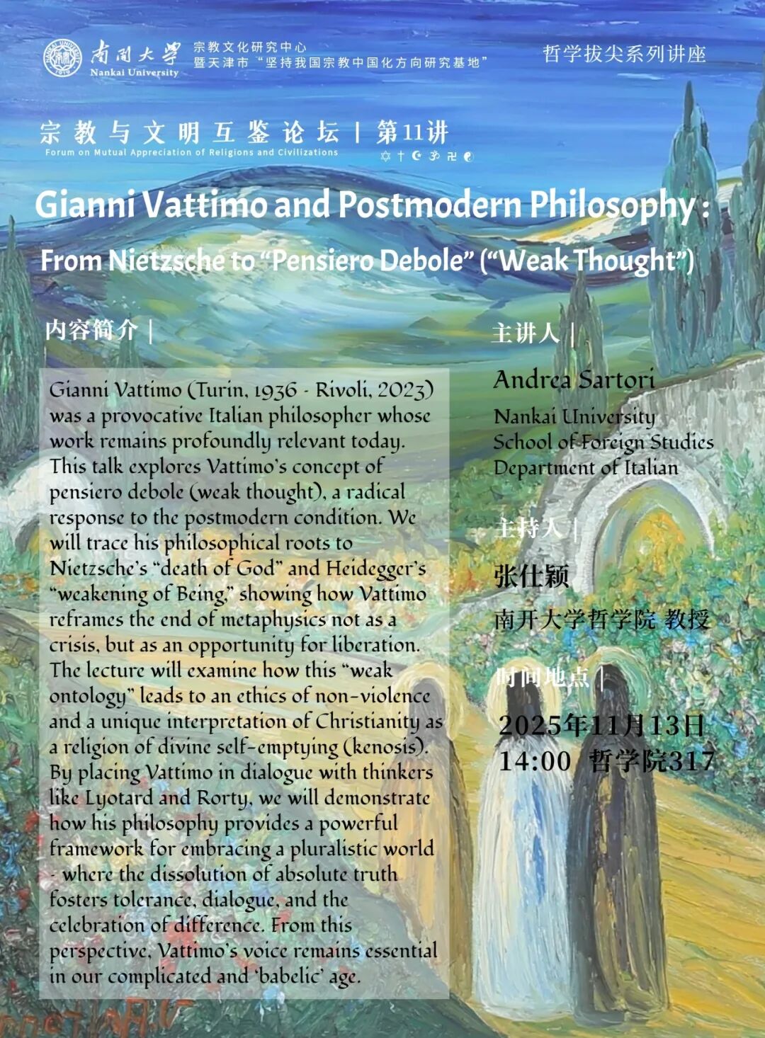 2025年11月13日下午,由南开大学宗教文化研究中心主办的“宗教与文明互鉴论坛”系列讲座第十一讲在哲学院317会议室举办。本次讲座由南开大学外国语学院副教授Andrea Sartori主讲,题目为“基阿尼·瓦蒂莫和后现代哲学:从尼采到‘弱势思想’”(Gianni Vattimo and Postmodern Philosophy :From Nietzsche to“Pensiero Debole”(“Weak Thought”))。讲座由南开大学哲学院张仕颖教授主持。