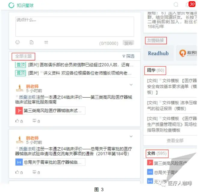 俱乐部整体布局如图3 所示,知识星球整体分为左右两栏,左边栏可以看到俱乐部发布的所有主题,右侧主要有俱乐部简介、友情链接、精华(主题)及文件等。