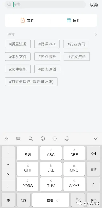 1.1 进入医咖俱乐部主页后,不断下滑就可以按时间顺序查看最新上传资料。但是1500份资料那么多怎么才能找到自己想要的文件呢?别急,点击右上角的放大镜后,可以进入搜索栏。